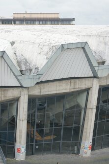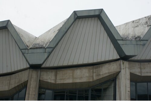 Ein Blick auf das heute mehr als 40 Jahre alte Gebäude lässt wiederum Zweifel sowohl an erster als auch zweiter Ansicht aufkommen. Zwar erinnert einerseits die renovierungsbedürftige Dachkonstruktion mittlerweile an eine schmutzige Gebirgslandschaft im Winter und die im Nachhinein lieblos eingesetzten Brandschutztüren der Seiteneingänge nehmen viel von der multiperspektivischen Ansicht des Baus. Gleichwohl wirkt die durchgliederte, am gesamten Werk trapezförmige Asymmetrie zwischen den seriellen Institutshochhäusern und gegenüber der blockhaften, schmalfenstrigen Bibliothek immer noch aufregend. So beeindruckt das Bauwerk gerade durch den Übergang der Pfeiler in das Faltwerk des Daches in seiner Vertikalität, die kontrastiert wird durch die mittig durchhängenden Horizontalelemente.