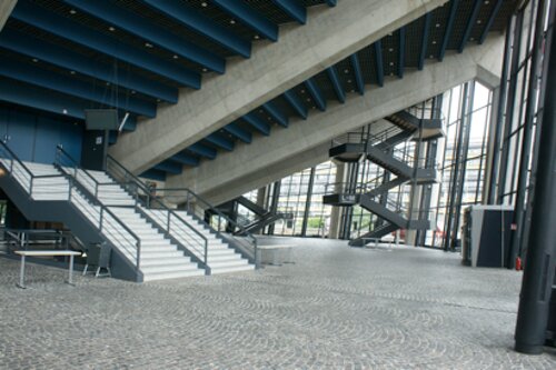 Der Südneigung des Baus entspricht einer leichten Senkung des Bodenniveaus im Inneren, wobei im Eingangsbereich die Kopfsteinpflasterung des nördlich anschließenden Forums weitergeführt ist. (Abb. 5) Im Foyer setzen mächtige, die Sitzreihen des Hauptsaals tragende Stützelemente einen horizontalen Gegenakzent zu den Fassadenpfeilern. Neben der zentralen Freitreppe zum Saaleingang - in der Sockelzone befinden sich Garderoben und Treppen ins Untergeschoss - sind Stahltreppen in die Konstruktion eingehängt. Der Hauptsaal schließlich entspricht in seiner Form einem um das Podium in der Mitte gruppierten Amphitheater. Die Architekten wollten hier, "dass sich das Auditorium nach Möglichkeit gegenübersitzt und damit eine Wirkung eintritt, die eine Verbindung und nicht eine Trennung der Gesellschaft bedeutet". (Brief der HPP-Architekten vom 4. Juli 1968, zit. nach: Kossel 2015, S. 263) Bemerkenswert ist weiterhin die 1998 eingebaute Orgel, eine der größten der weltweit agierenden Bonner Firma Johannes Klais.