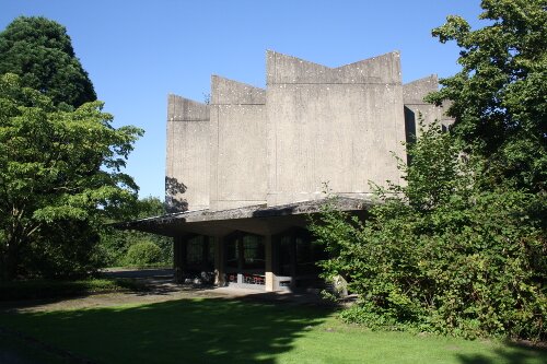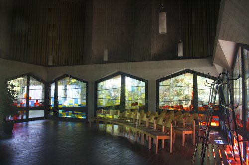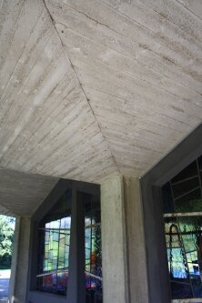 Der Sockel der Trauerhalle scheint sich durch die Buntglasfenster in seiner Basis aufzulösen (Abb. 2). Die beiden Eingangssituationen sind etwas bunter als die Fenster gestaltet und befinden sich im Norden und im Osten des Baus. Auf den Stützen erhebt sich ein horizontales Sichtbetonelement, welches auf allen Seiten weit über die Sockelzone hinausragt. Darüber befindet sich ein ebenfalls quadratischer und skulptural gestalteter Sichtbetonkörper, der vertikal mehrfach gestaffelt ist und nach oben einen gezackten Abschluss bildet. Dieser wirkt wie eine Bekrönung und erinnert an eine stilisierte Krone.