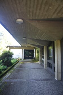 Der gesamte Bau basiert auf einer Stahlbetonkonstruktion, bei der alle genannten Sichtbetonoberflächen aus Weißzement gearbeitet sind und die Schalung des Beton deutlich sichtbar ist (Abb. 4). Die Trauerhalle ist lediglich durch überdachte Wege aus Beton mit den beiden anderen Gebäuden im Osten und Süden der Anlage verbunden (Abb. 5). Der südliche Flügel beinhaltet den Leichenzellentrakt. An ihn schließt im Osten das Betriebsgebäude mit Räumen für den Pastor, die Angehörigen und die Mitarbeiter an. Die beiden Gebäude sind eingeschossig und als schlichte, kubische Flachbauten errichtet. Das Mauerwerk besteht aus weißem Kalksandstein, die Rahmen der Fenster aus schwarzem Kunststoff. Beide Bauten treten in ihrer unauffälligen Gestaltung deutlich hinter die Trauerhalle zurück.